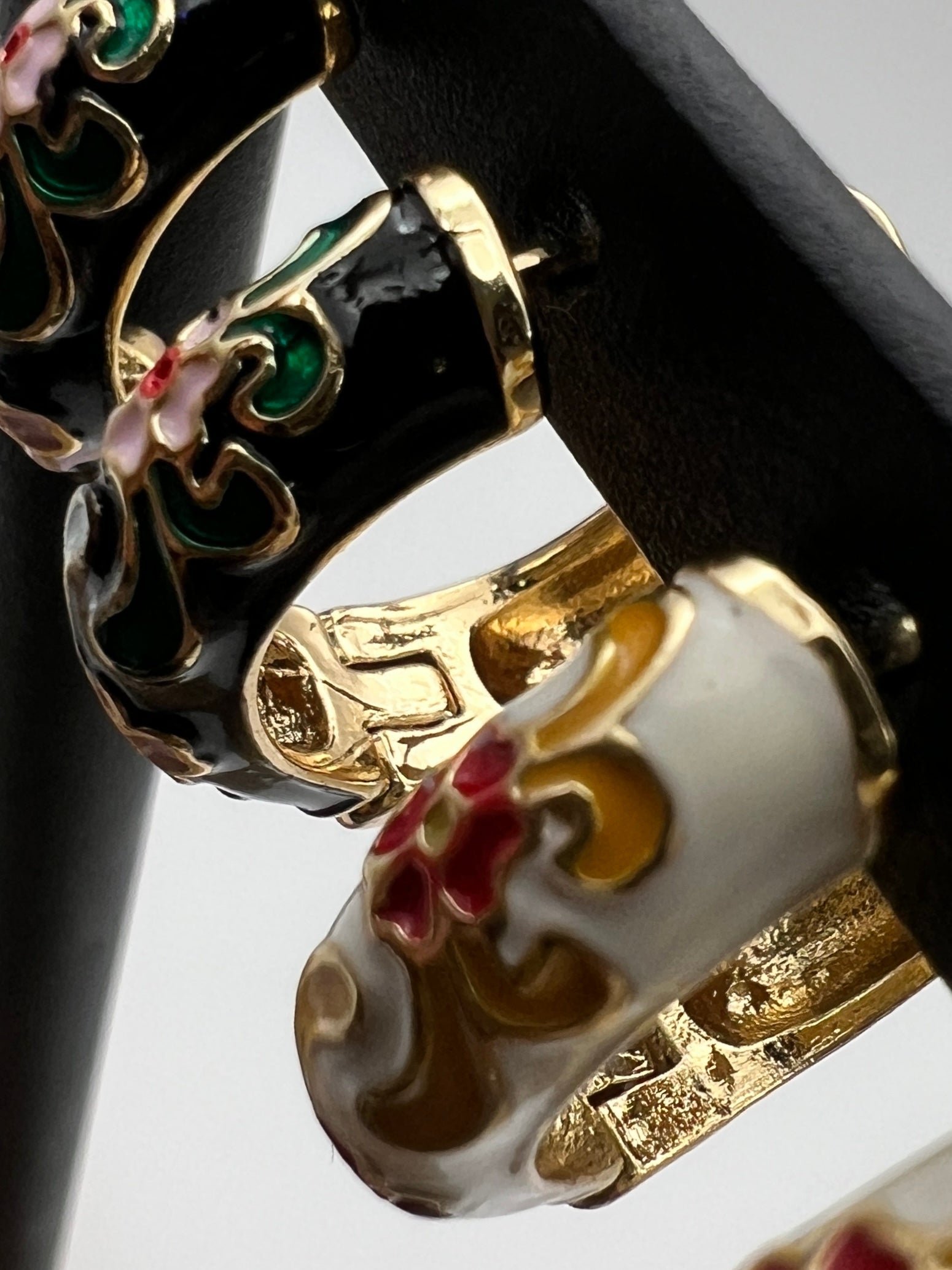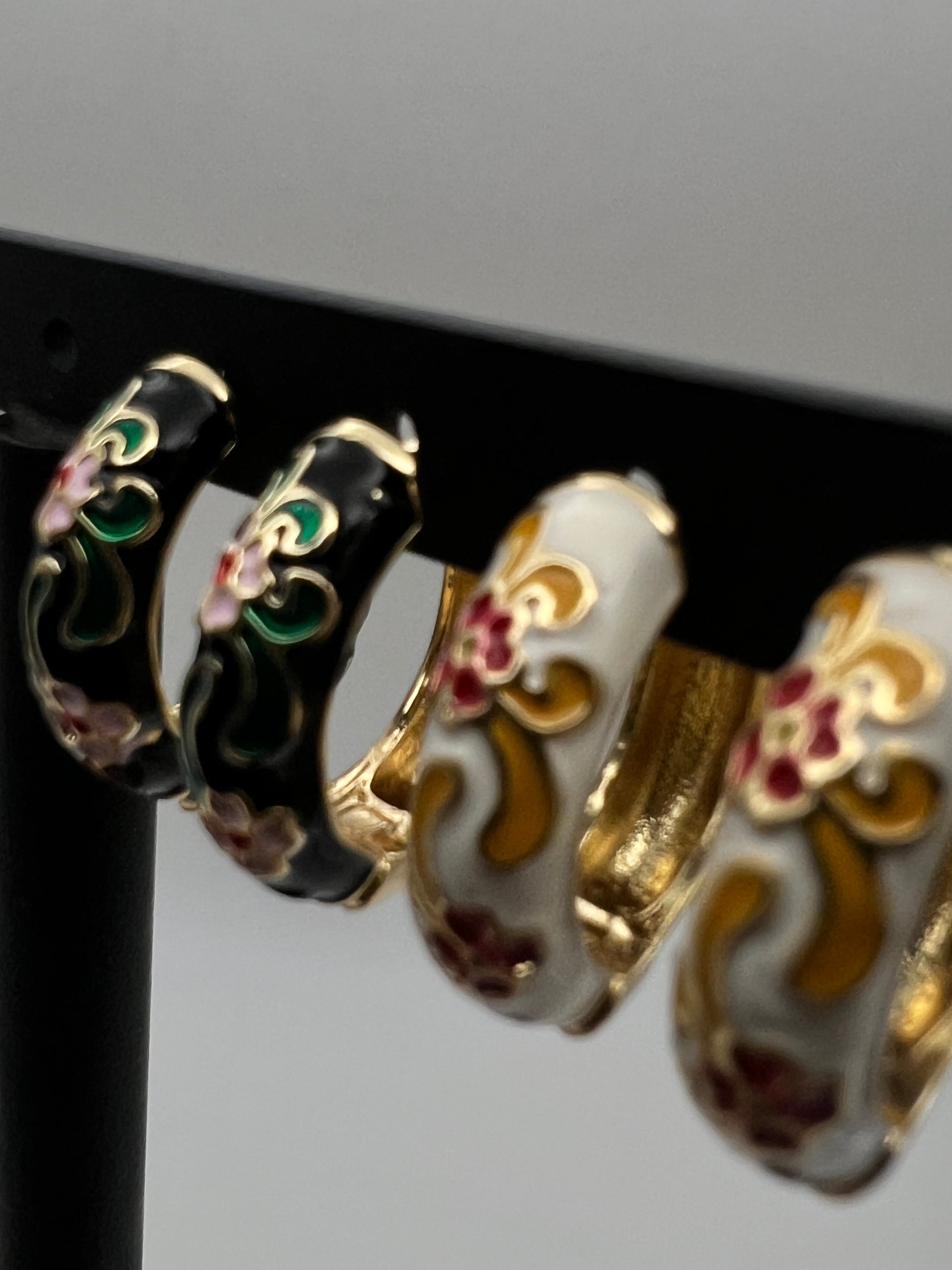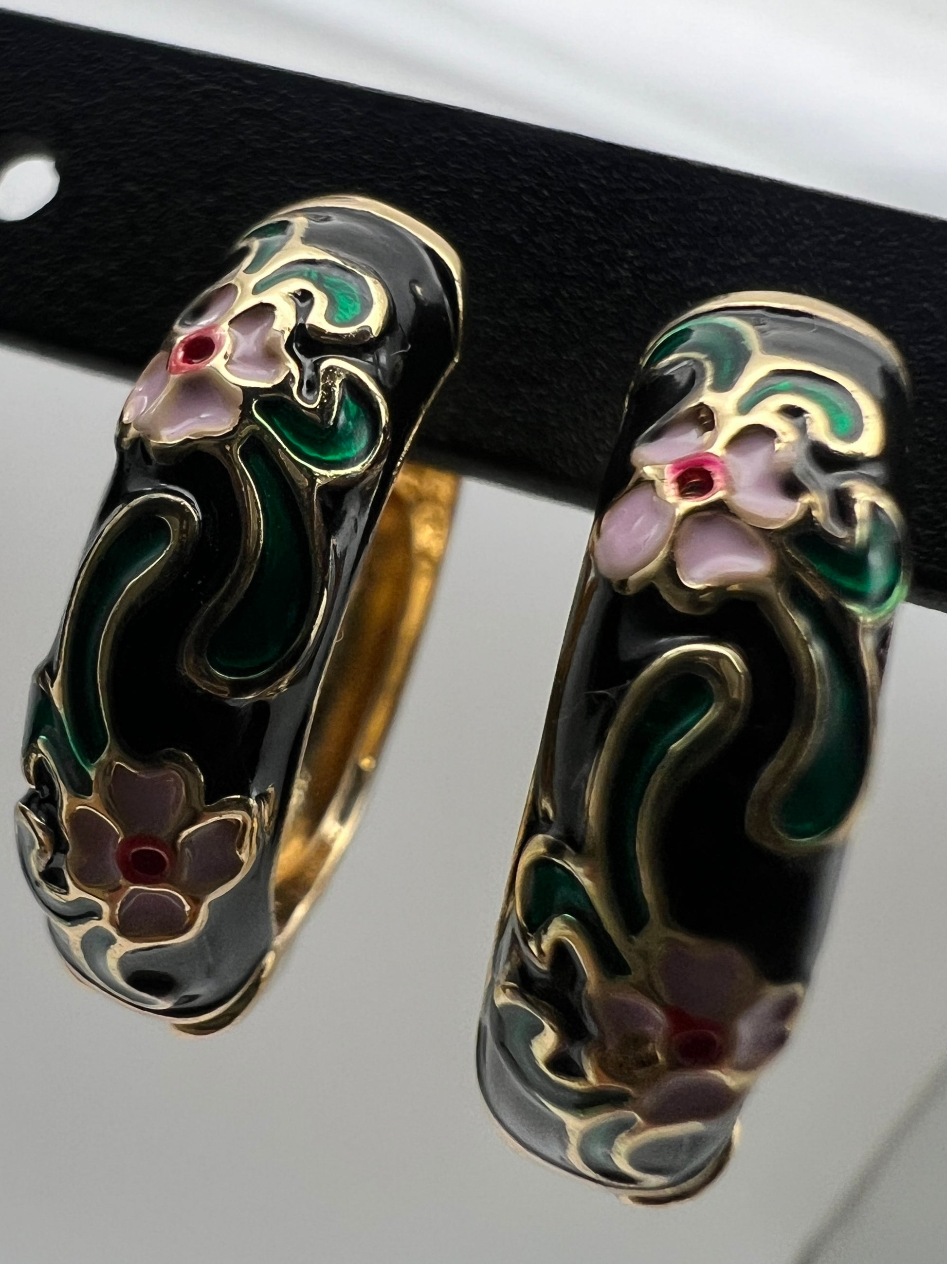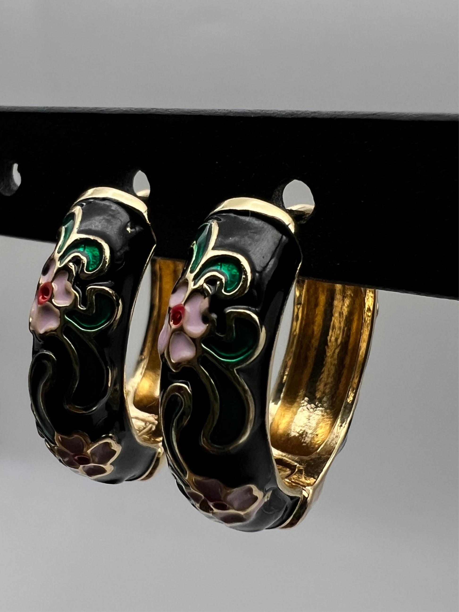 Dark and dreamy 🖤 Black enamel hoops with golden floral accents — bold and versatile.