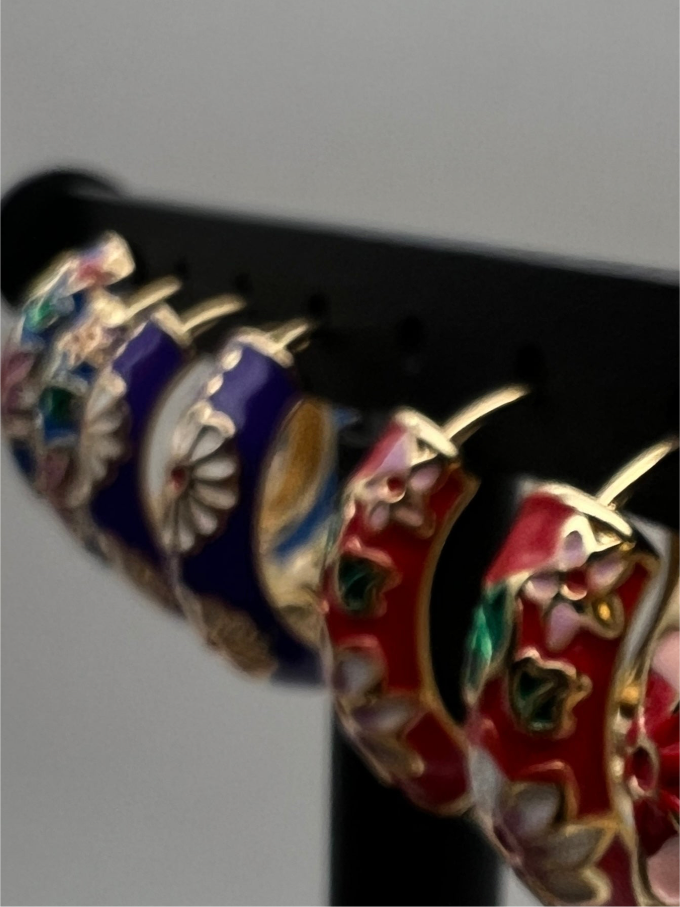 Playful and striking 💜 Purple enamel hoops with golden florals.