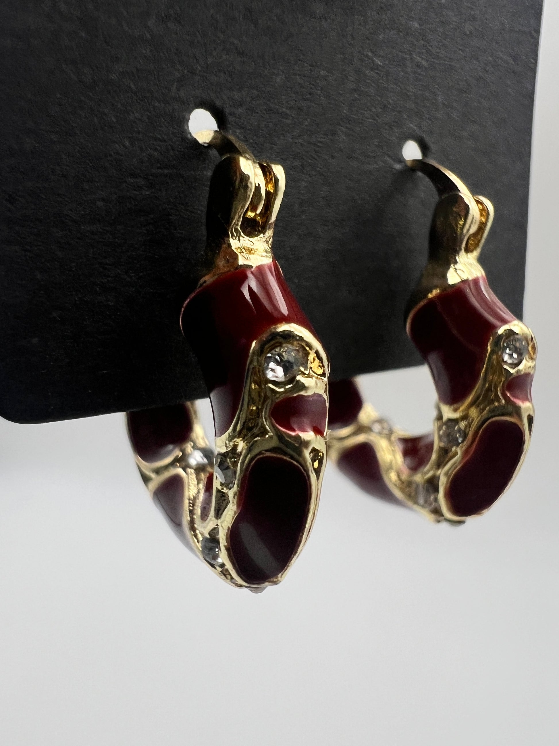 Deep, rich, and unapologetically luxe. The Gilded Rouge Hoops blend a bold crimson enamel finish with gold sculptural detailing and crystal accents for just the right touch of drama. Designed to capture light — and attention — these hoops bring vintage glamour into the modern day.